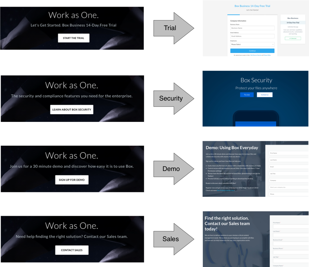 SMB visitors might be ready to start the free trial once they have seen the demo, the enterprise infosec team might be interested in learning about Box’s security features first, customers who are not ready to speak to sales or sign up might benefit from the online demo, and decision makers at enterprise accounts and who are engaged might be ready to fill out the sales form.