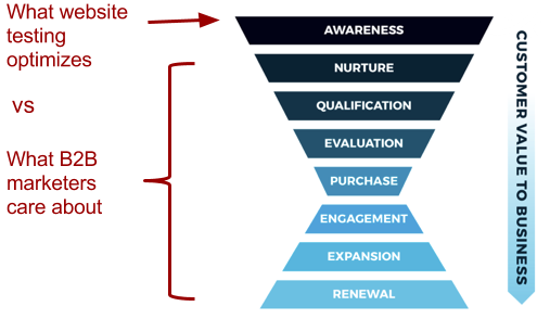 If you cannot measure it, then you cannot optimize it. Most testing tools were built for B2C and have real problems measuring anything that happens after a lead is created and further down the funnel, off-website or over a longer period of time.