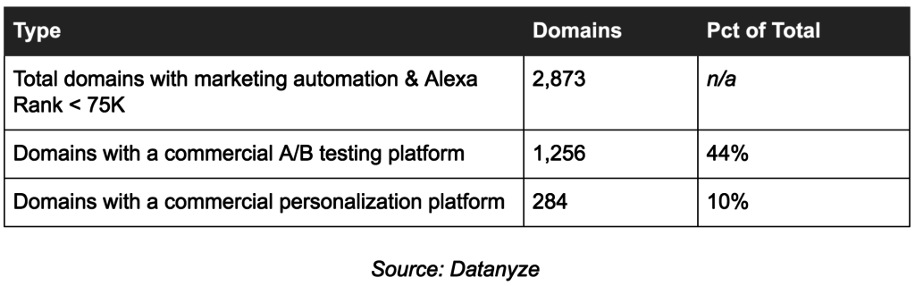Looking at websites that have a major marketing automation platform and reasonably high traffic, you can see the discrepancy between those using commercial A/B testing vs Personalization: