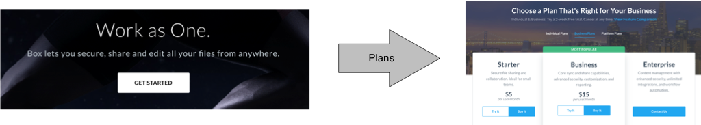 Box.com has an above the fold Call to Action (CTA) that takes you to their pricing page. This is a sensible approach when you do not have a lot of context about the visitor because from the pricing page, you can navigate to the right plan and option that is most relevant.