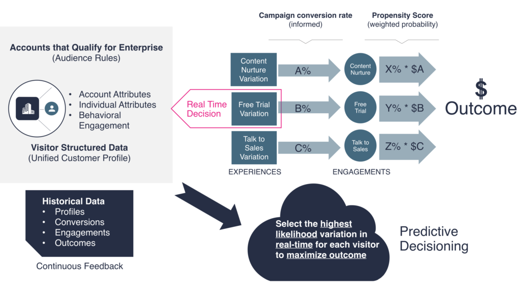 In this case, what we are predicting, is the best website visitor experience that will lead to an optimal outcome. Rather than testing populations in aggregate, we are making experience predictions on a 1:1 basis based on all of the available context and historical outcomes. Our variation scores take into account expected conversion value as well as conversion probability, and we continuously learn from actual outcomes to improve our next predictions.