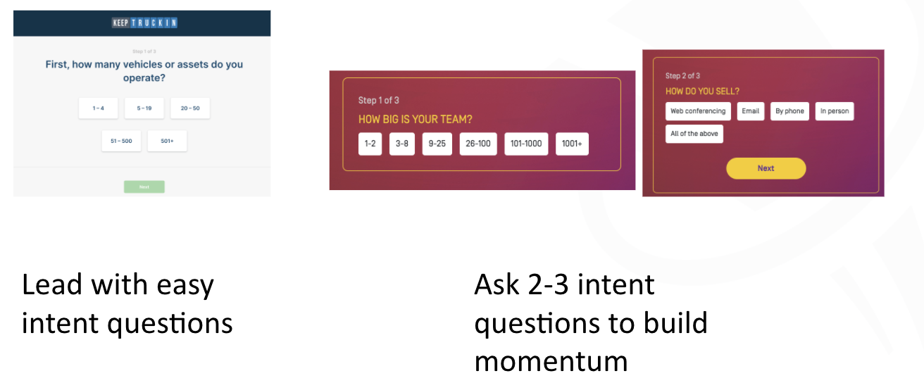And some key things to keep in mind with multi-step forms, we want to make it easy. So if you think about doing it for yourself, think about in your funnel, what are easy and 10 questions to ask to get them started? Also, you want to make sure you ask a couple of questions, so you want to get the ball rolling, create that momentum, and get them committed to completing that conversion process with and completing the rest of the form. So here you don't want to ask for first name, last name, email, to get started, you typically want to ask for, how large is your team? What is your role? What is your product interest? But things that are more intent-focused so they can get started without hitting hurdles.