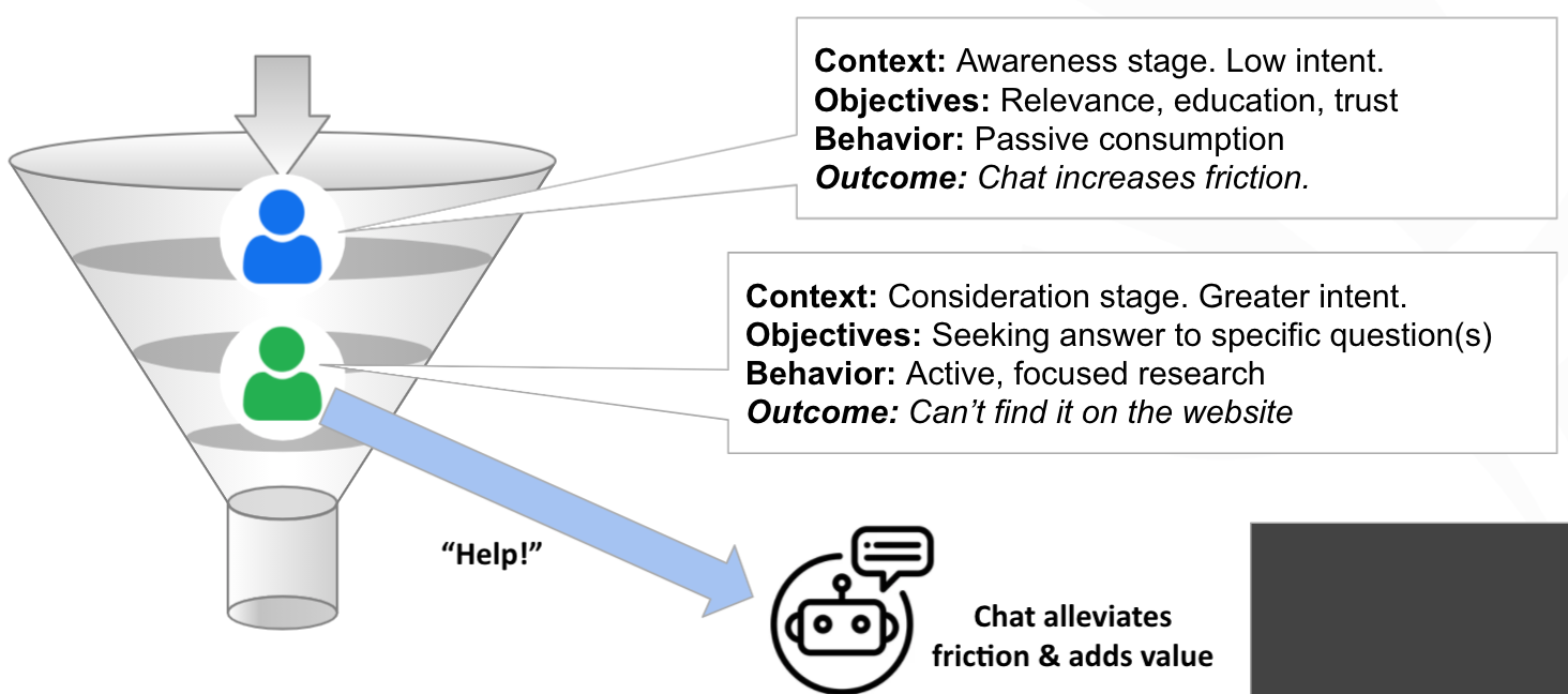 And let's contrast that with a lower-funnel visitor that is in the consideration or decision stage that has greater commercial intent. Typically, they're seeking answers to very specific questions on your site. And unlike passive consumption, they're actively trying to answer that question, and then they're doing some focused research. And if they can't find it on your site, that introduces friction. So in this case, reaching out to chat can actually add value by alleviating that friction of not being able to find the answer to the question on your site and connect them either with a bot or with a salesperson.