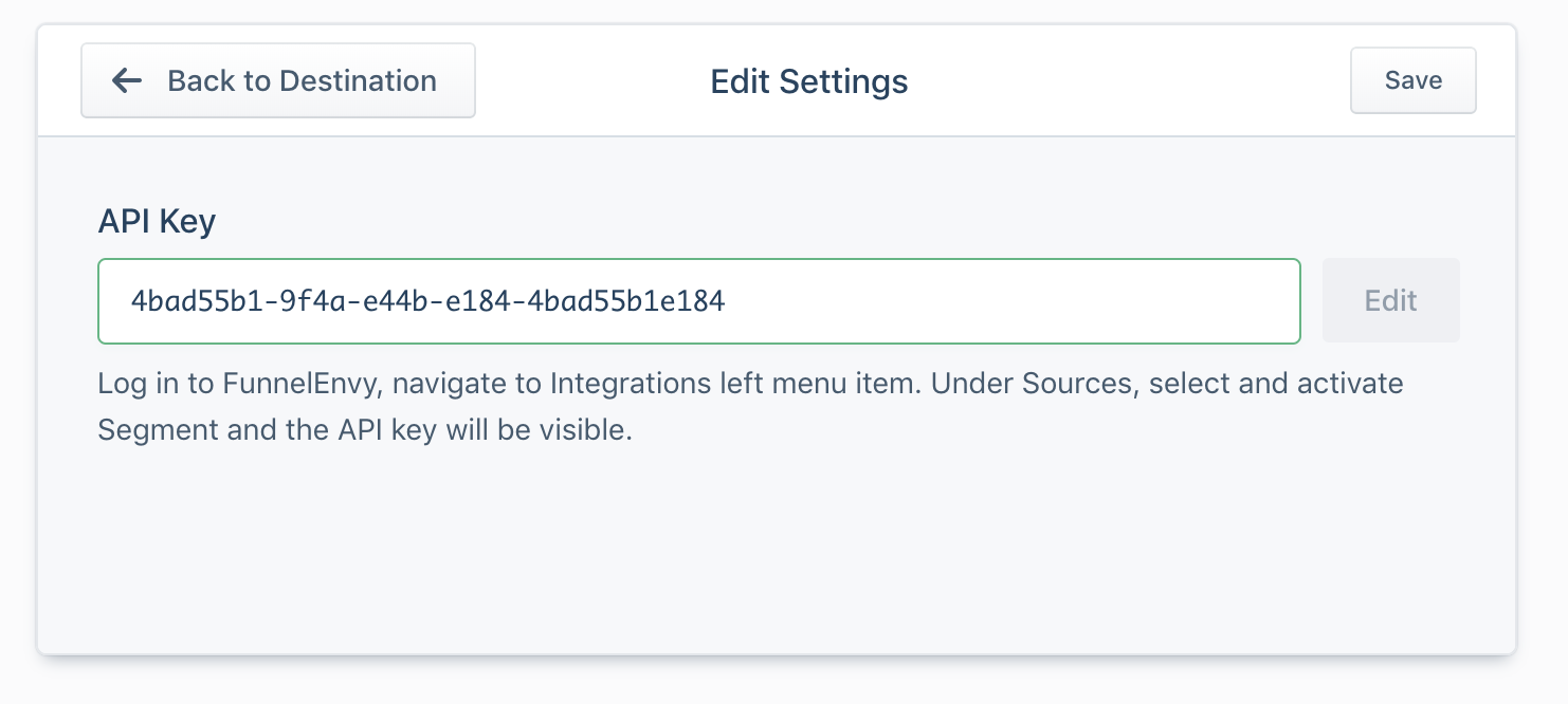 In the settings you’ll need to add the API key that you copied from the FunnelEnvy platform when you activated Segment integration.