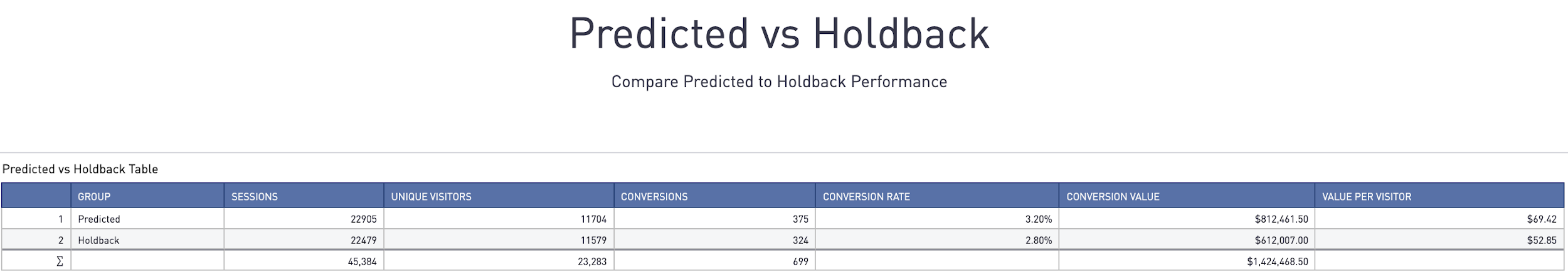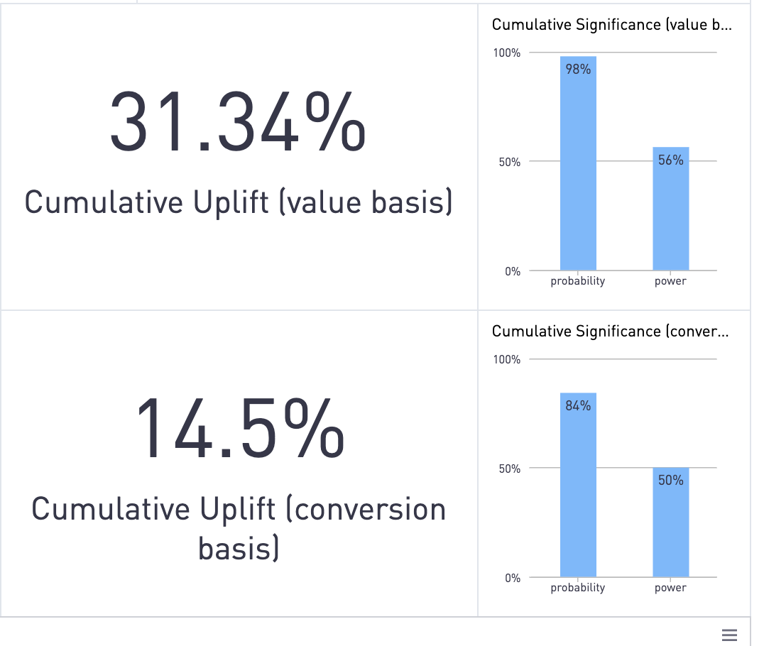 With our integration with Segment, we are able to credit and report on how much revenue our personalization activities are generating and which personalization experiences covert best. We can then show incremental revenue by running a controlled A/B test that serves half the audience the control experience and the other half the predicted experiences. We then measure the difference between the two groups and report on uplift in conversion and value per visitor and calculate statistical significance.