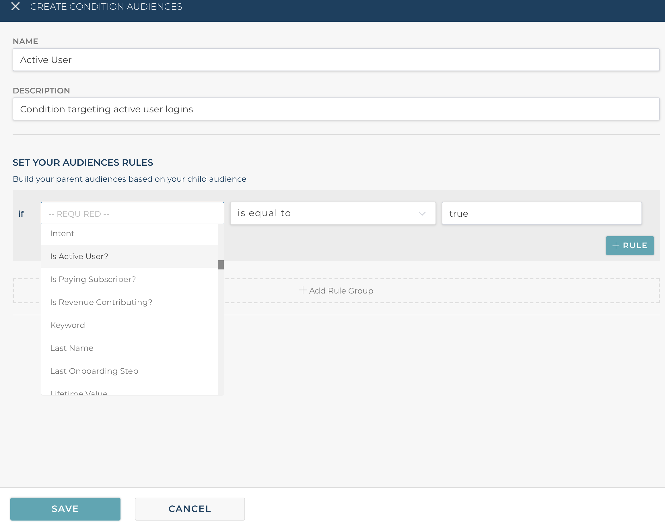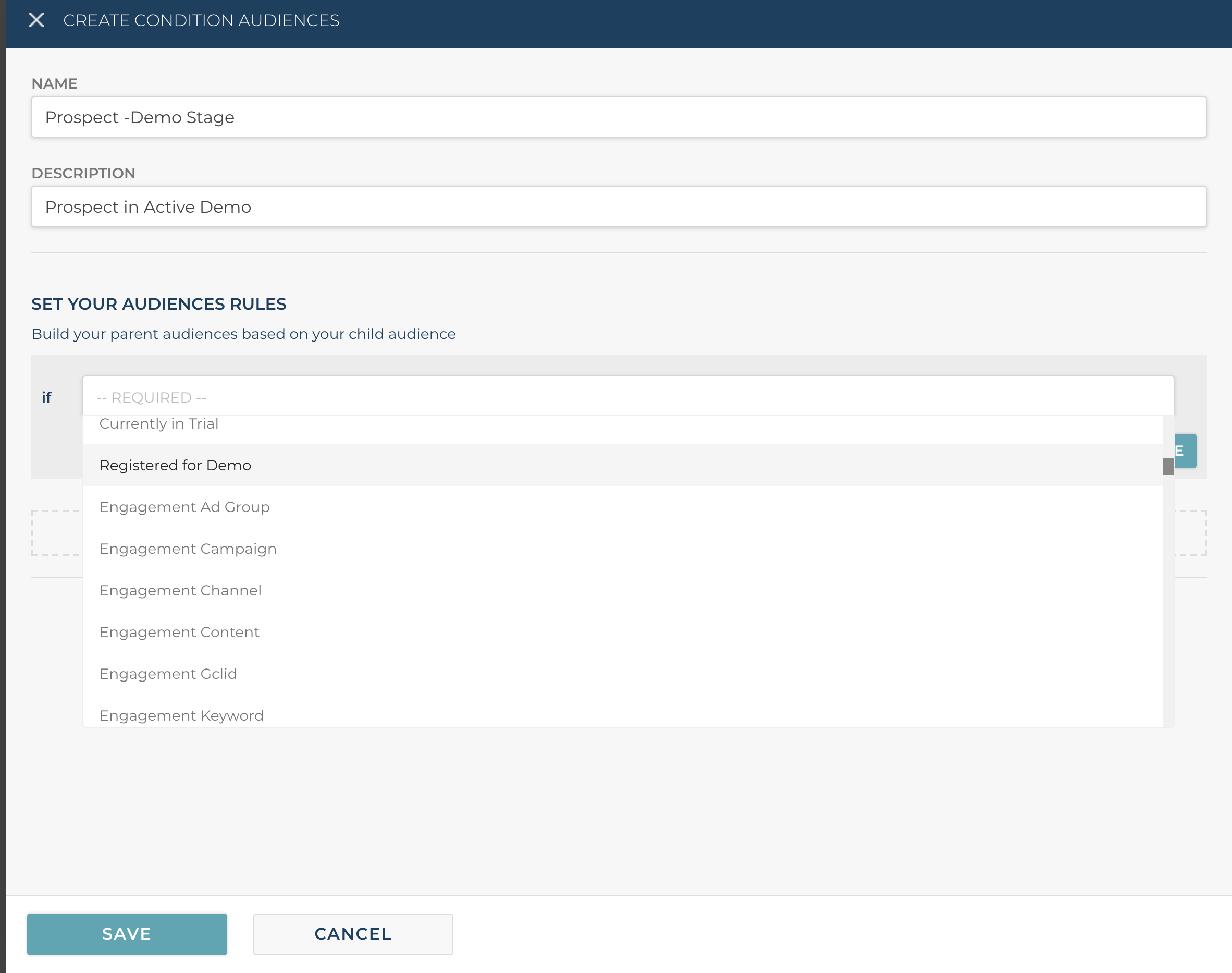 In this example below we want to target active prospects who have completed a demo. Our client tracks in Segment which users complete a demo based on a Registered for Demo attribute. That allows us to easily create conditions and audiences based on the user being in the demo stage, like in the condition screen below.