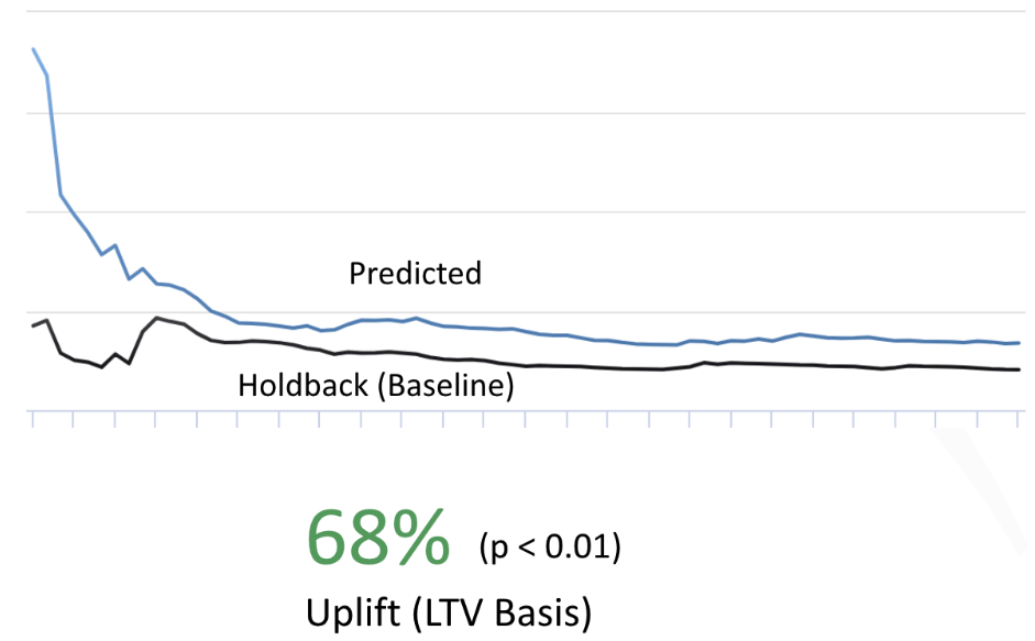 Looking at cumulative results below we see a significant and consistent improvement in the predicted experiences over holdback. Visitors who were subject to the predicted experiences were worth 68% (p < 0.01) more on average than those that saw the control.