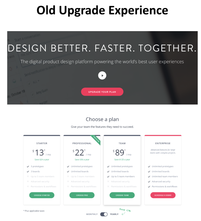 During our analysis we noticed a lot of traffic from free plan users was landing on the home page. When those visitors arrived, InVision showed them a Call to Action (CTA) to “Upgrade your Plan”. When the visitor clicked on this CTA, they were taken to the page of the various premium plans, giving them the option to enter their payment information after they made a selection.